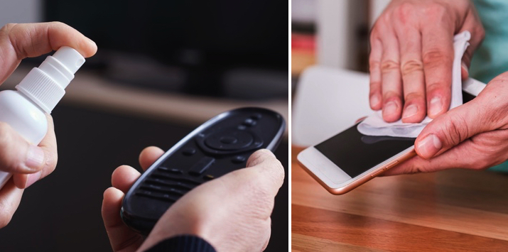 Todo lo que este en contacto frecuente con las manos se debe desinfectar varias veces en el día, por ejemplo el celular, el control del televisor, e incluso las manijas de las puertas y gabinetes de la casa.
