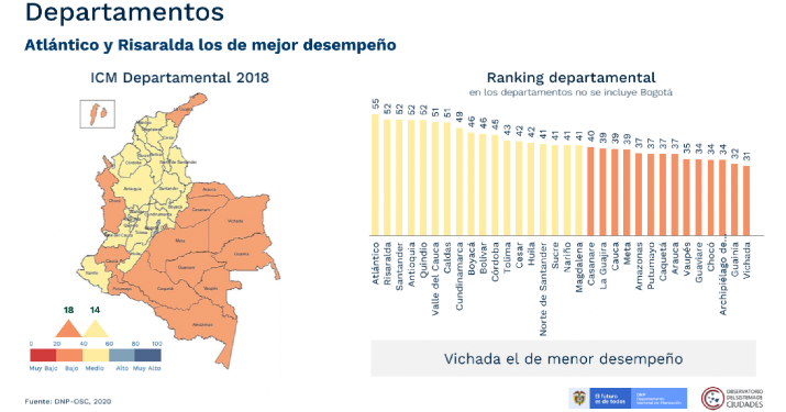 Específicamente, el ICM es un indicador que permite determinar los avances y retos en las ciudades y municipios del país. La estructura del indicador permite un análisis multidimensional a diferentes escalas territoriales, otorgando un puntaje de 0 a 100, siendo 100 el mejor desempeño.