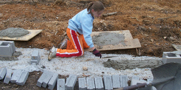 Cerca de nueve meses duró la construcción de la nueva vivienda, mamá e hijos trabajaron fuertemente, Jada llevaba el agua desde el estanque del vecino para utilizarla en la mezcla de cemento para sentar las bases, Drew colaboró con mover la madera y Hope cocinó para todos.