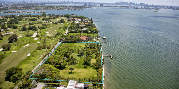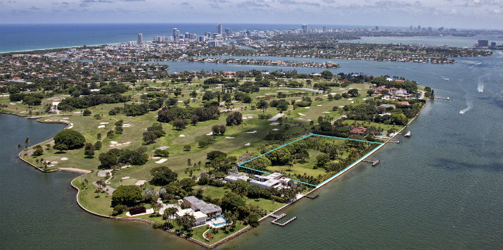 Los lotes están ubicados en la Bahía de Biscayne, miden 29.700 metros cuadrados (3.2 hectáreas) y tienen 240 metros frente al mar, en el exclusivo islote de Indian Creek al norte de Miami Beach.