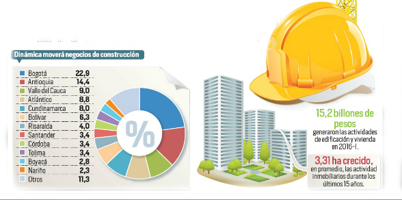 Pero no es solo vivienda, ya que de lo que se hace en el país en todo tipo de construcciones, el 22,9 por ciento correspondió Bogotá, seguido de Antioquia, con 14,4 por ciento; Valle del Cauca, 9 por ciento y Atlántico, 8,8 por ciento.