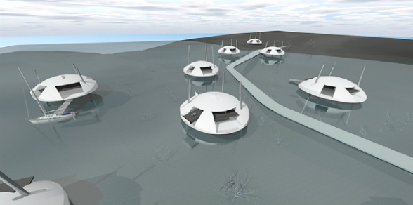 Cada casa está anclada al fondo de la bahía mediante un sistema de engranajes y pueden ser reubicadas si es necesario. Su techo en forma de esfera es aerodinámico, por lo que resistente a los vientos fuertes. Además, estas casas cuentan con un sistema integrado de energía fotovoltaica, la cual es una fuente de energía renovable que se obtiene a partir de la radiación solar.