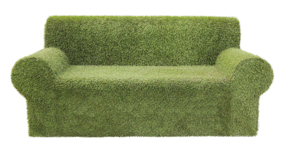 El sofá, diseñado por el arquitecto y paisajista Iván Ibarra, también es eco-friendly. Está hecho con partes de láminas, producto del residuo de la fabricación de materas de lámina. Este material es soldado y moldeado con la forma de un sofá. Posteriormente, se forra con césped artificial, que luce como si fuera natural.
