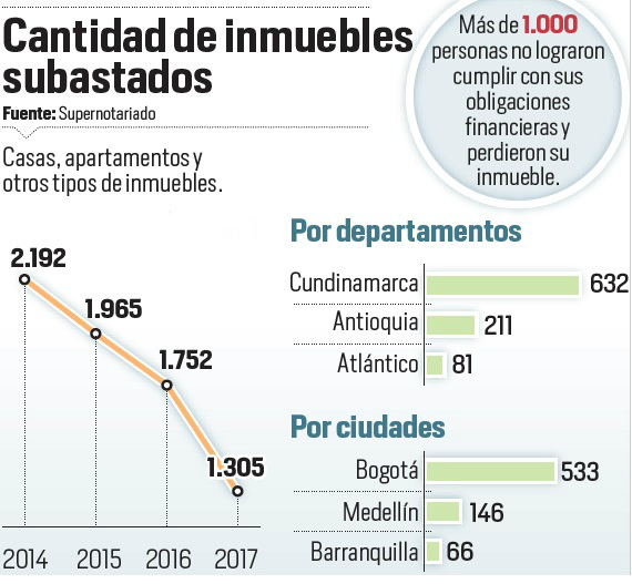 Al respecto, la Superintendencia de Notariado y Registro reveló que la cantidad de subastas en el periodo analizado sumó 1.305. Esta cifra, en comparación con los datos del mismo lapso del 2016 (1.752), representaron una caída de 25,5 por ciento.