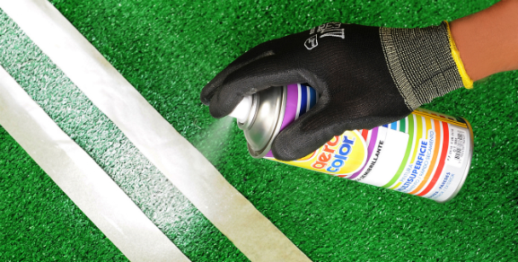 6. Con cinta de enmascarar delimita el área de la cancha y píntala con la pintura en aerosol blanco.