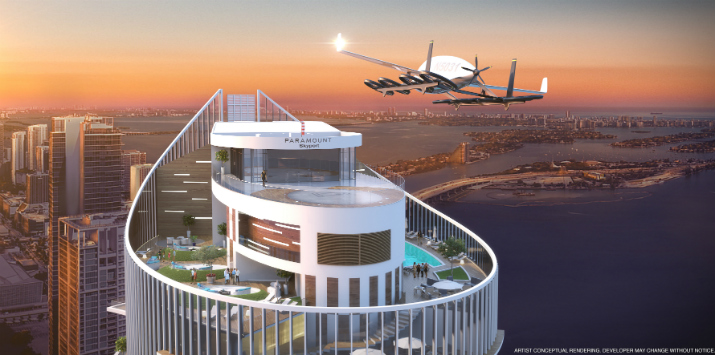 Pensando en ello, Dan Kodsi, desarrollador de la torre Paramount Miami Worldcenter, modificó el diseño de esta para adaptar un terminal aéreo de 5.000 pies cuadrados encima del edificio residencial.