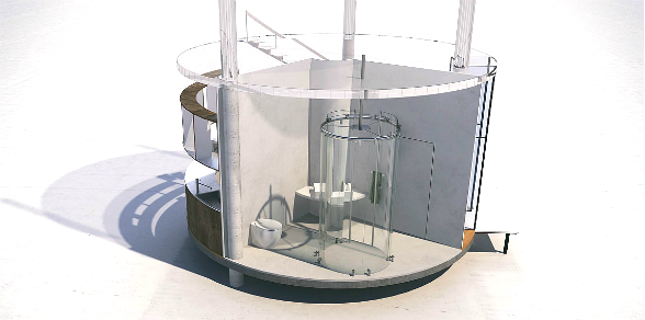• La cocina, el baño y la habitación se adaptan a la forma cilíndrica.