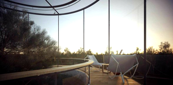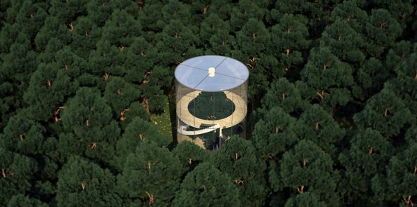 • La edificación de cuatro pisos es cilíndrica, con bases metálicas, pisos de madera y su exterior es completamente en cristal.