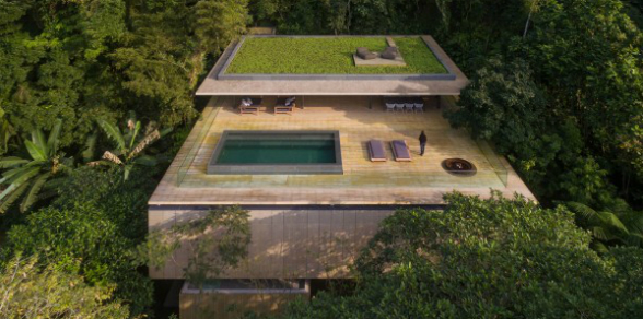 Sin duda el tercer piso es uno de los más llamativos y espectaculares de la vivienda. Allí está una terraza con una piscina de lujo, jacuzzi, sauna y un espacio con cubierta verde ideal para contemplar la majestuosidad de la selva de Brasil.