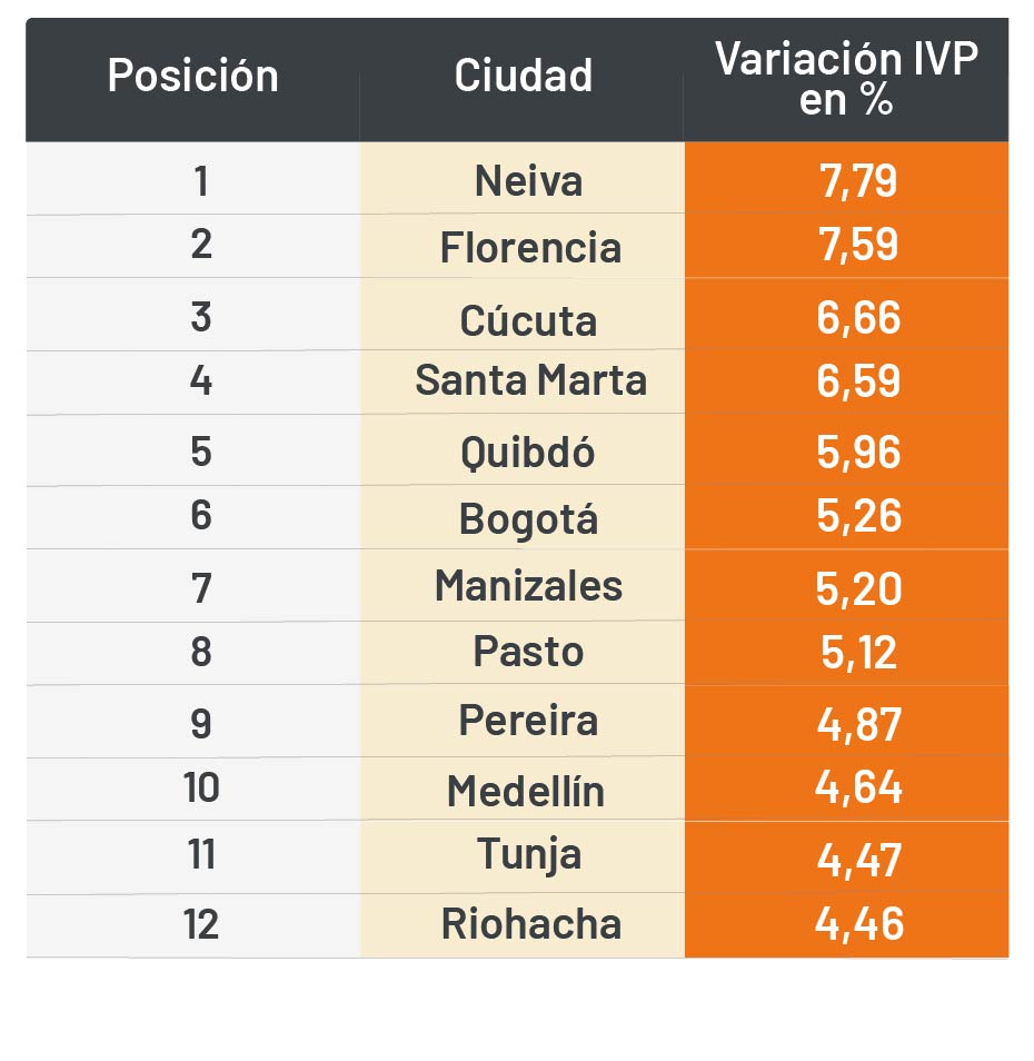 Así mismo, algunas de las ciudades que registraron algunos de los valores más bajos de IVP fueron Ibagué (3,94%), Popayán (3,92%) y Valledupar (3,37%).
