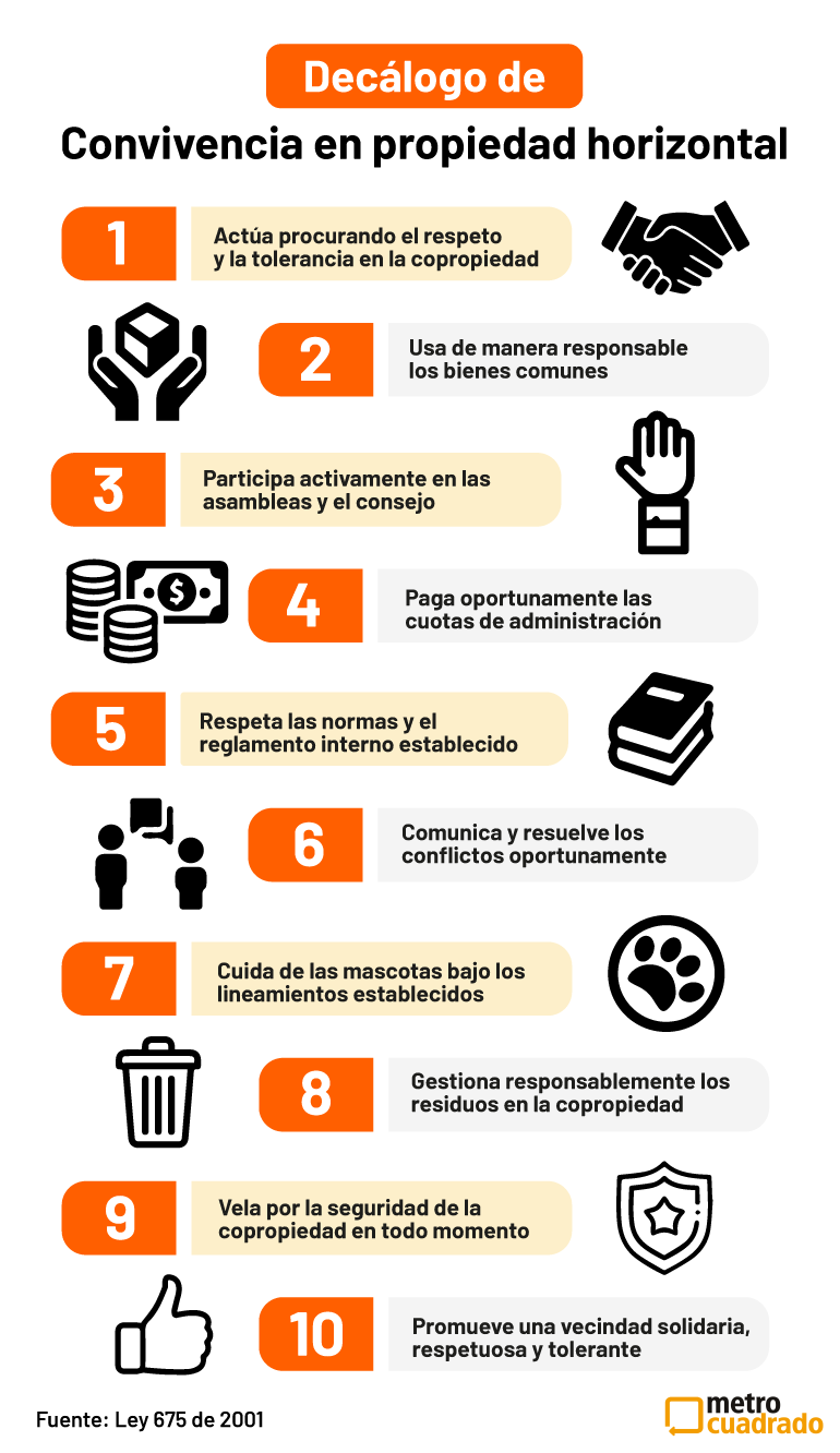 La convivencia en propiedad horizontal requiere del compromiso y la colaboración de todos los residentes. Siguiendo este decálogo y respetando las disposiciones de la ley 675 de 2001, será posible construir una comunidad más armoniosa y segura para todos en la copropiedad.